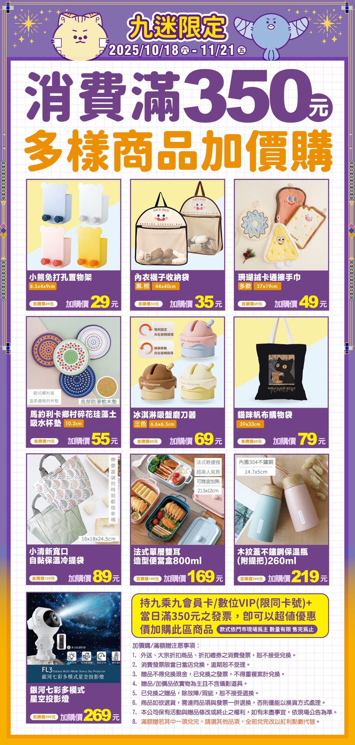 持九九卡/數位會員消費滿350元,即可加購期間限定主題商品。