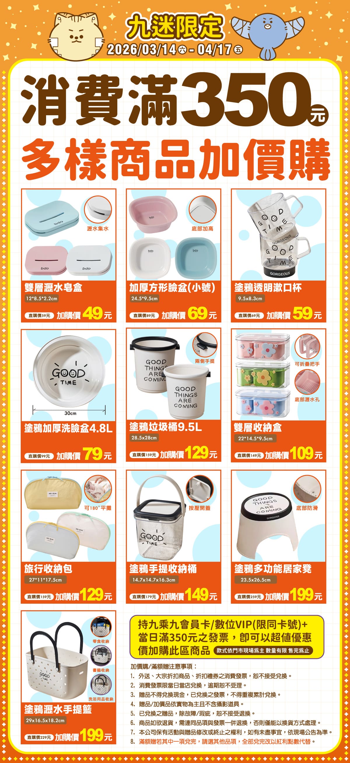 持九九卡/數位會員消費滿350元,即可加購期間限定主題商品。