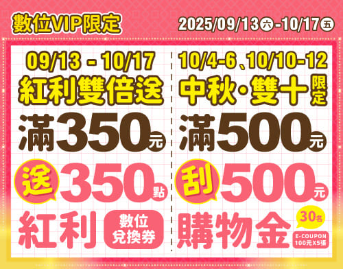 促銷活動2025.09.08 285期【數位VIP限定】滿350送紅利350點,中秋雙十限定滿500刮購物金500元