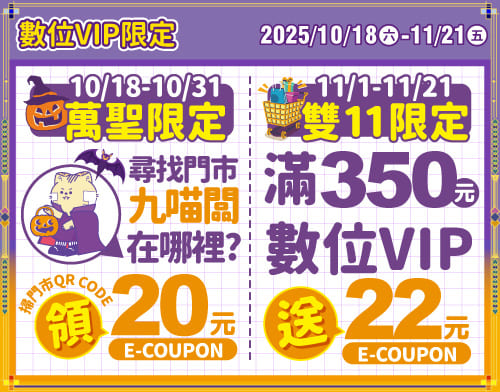 促銷活動2025.10.09 286期【數位VIP限定】萬聖限定,尋找門市九貓闆領20元 / 雙11限定,滿350元送22元