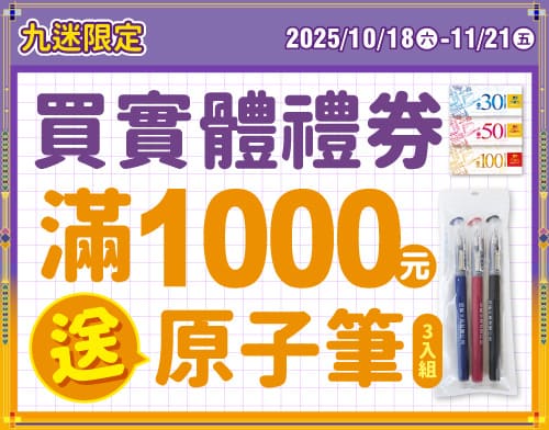 促銷活動2025.10.09 286期【實體禮券限定】滿1000元(含)以上,送原子筆3入組