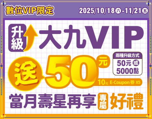 促銷活動2025.10.09 286期【數位VIP限定】升級大九送50元E-COUPON