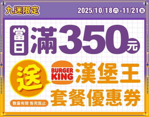 促銷活動2025.10.09 286期【九迷限定】滿350送「漢堡王」套餐優惠劵